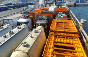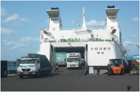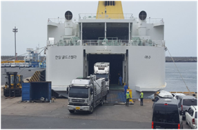 3) 제주항 카페리, 화물선에 화물 적재 차량 자체를 선적하여 제주항으로 이동합니다.